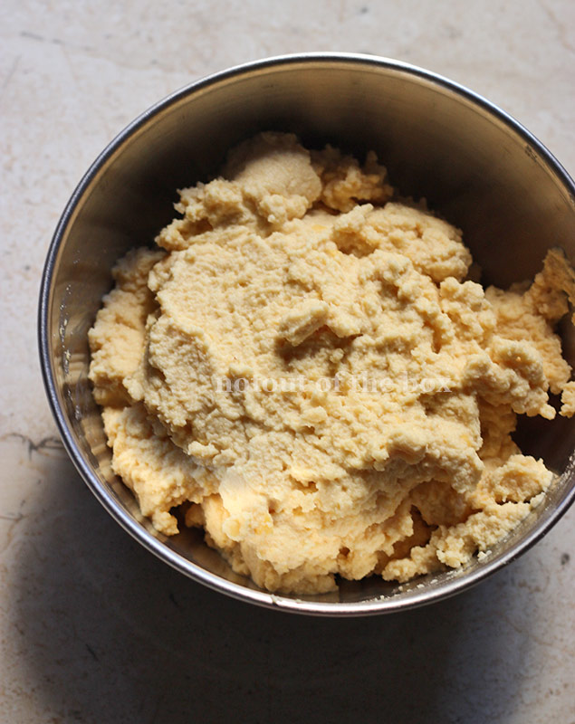Heat 1/4 cup oil in a deep frying pan (non-stick preferably). Temper with 1 tsp of cumin seeds, add the chana dal paste, salt, hing, 1 tsp sugar, and ¾ tsp ginger paste. Mix well and stir constantly until a soft dough like consistency forms and be somewhat sticky. Cook this on a medium-high flame. Remove from heat. Grease a flat dish with oil. Spread the dal mixture immediately on this dish (A pie dish works perfectly for this), press it with the spatula to make it flat and smooth on top. Now cut into big squares or diamonds while warm.