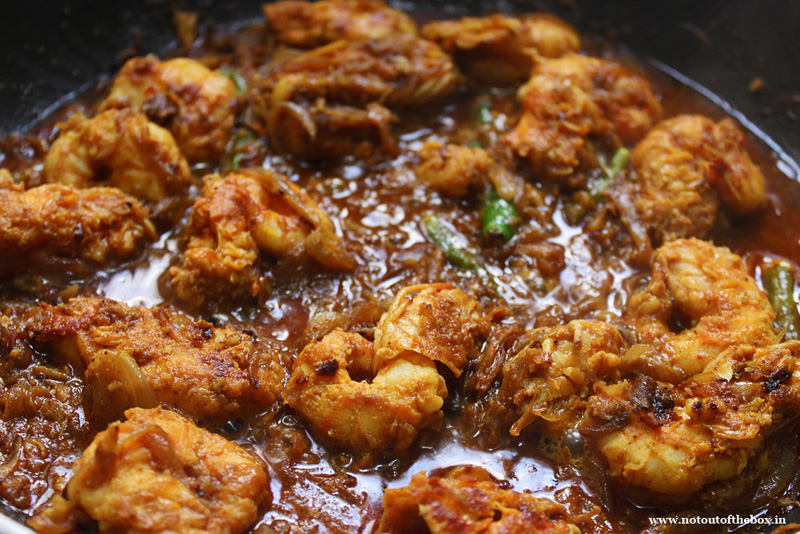 Heat oil in a frying pan, add 4-5 tbsp of vegetable oil, shallow fry the prawns on medium flame for 2-3 mins . Keep aside. In the remaining oil (Add some more oil, if needed) add the sliced onions. Sauté till golden brown in color. Add ginger-garlic paste & the other ingredients mentioned for ‘ Prawn Masala’. Mix well & fry till oil separates from the masala. Now add the fried prawns, mix well & cook on low heat for 5-6 minutes. Stir in between. Add 1 1/2 of water at this stage. Mix well, cook till the raw smell of masala goes. At the end of this preparation the gravy should be medium thick in consistency. If your gravy is drying up add some more water.