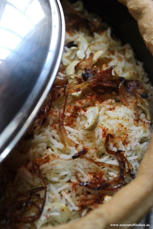 Close with a tight fitting lid, seal the edge with atta dough (make a log with the dough, then seal). Turn on the heat. Put a tawa. Now put the biryani vessel on it. Keep the flame as lowest as possible. Put on dum for 30 minutes.