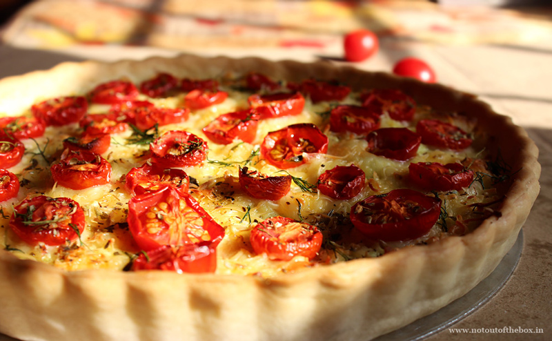 Now evenly cover the base of the tart with paneer mixture. Add grated cheese on top. Place the tomatoes (cut side up). Sprinkle dill & oregano. Bake for 25 minutes. Remove from oven. Wait for 10 minutes.