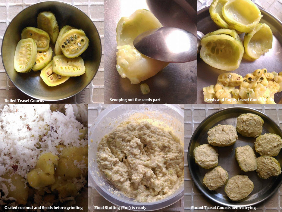 Wash and boil the teasel gourds till the seeds part turns soft, don’t over boil, so check in between while boiling. Remove from the heat and keep aside, let them cool. Now with the help of a teaspoon gently scoop out the seeds and flesh.