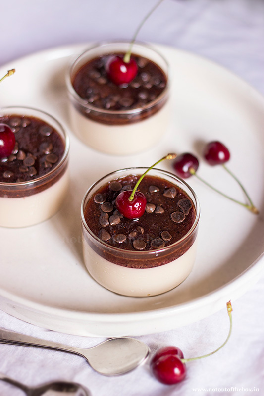 When I was buying the first pack of this season’s wild cherries, I was planning to make so many things. Plenty of ideas were there in my mind, and, yes, making ‘Panna Cotta’ was one of them. Delicately flavoured, this Panna Cotta is a fancy one! This is something what you can serve with pride. I’m quite satisfied to develop this new recipe of a finer dessert, what is quite eye soothing and gorgeous by its own look. The bites of chocolate chips, with a hint of cinnamon, followed by the flavour of cherries and the smoothness of coffee-cream layer will take you to the next level of happiness. Try this with fresh cherries and don’t forget to tell me your experience! 🙂