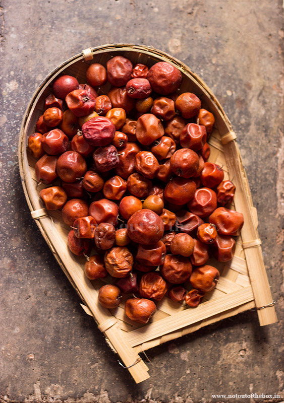 The key ingredient here is Kul/Ber (jujube). It’s a seasonal sweet & tangy fruit available for a few months only during winter. This chutney calls for small-sized Ber that we call Topa Kul in Bengali. And you need the ripe ones to make it. The recipe is easy to do, so, give this a try before Ber disappears from the market.