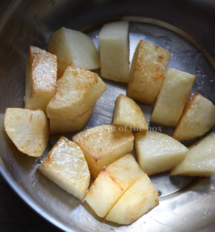 In the remaining oil of the kadai fry the cubed potatoes until golden brown in color, keep aside. Remove rest of the oil from the kadai.