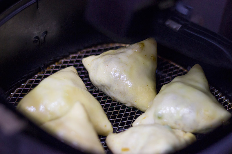 If you’re using an air fryer brush all the samosas with vegetable oil before putting them into the air fryer basket.