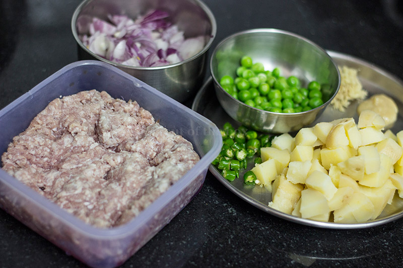 Now add mutton keema, salt, and green chillies. Mix well, cover and cook over low heat for 4-5 minutes. Keep stirring in between. Now add ¼ cup water into this, mix and cook further. Add boiled potatoes and peas when mutton keema is half cooked. Mash the potatoes a bit with help of the spatula during the time of cooking.