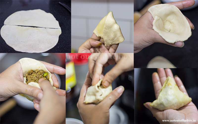 Make balls out of the dough (Confused about the size of the dough ball? Check picture for reference). At the time of rolling apply a few drops of oil on each ball. Do this for one ball at a time, when you begin to roll. And grease the rolling surface with little oil too; you need to do this every time before rolling each ball. Start rolling evenly; make a round shape like roti, keeping in mind that the thickness should be a bit more than our regular roti. With knife or pastry cutter cut the samosa pastry from the middle. Now take one half circled samosa pastry sheet, make a cone shape by joining the two edges. Stuff the keema filling inside. Apply little water on the open edges of samosa and seal. Make sure that all the edges are sealed properly. Otherwise at the time of frying filling may spill from inside into the hot oil, and that can be quite messy.