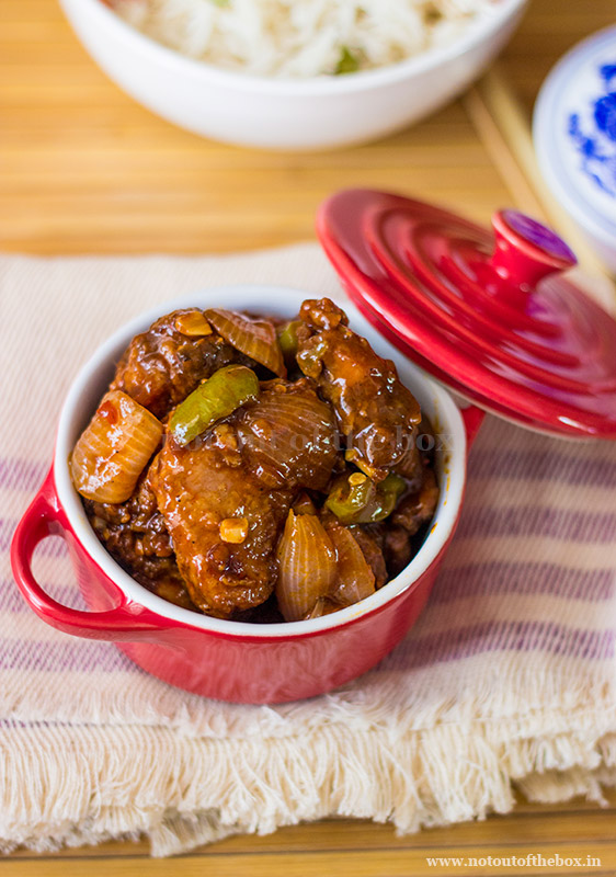 If you want to have Dry Chilli Chicken add 1/4 cup of water at the time of cooking, it will make the chicken dryish like in the picture below.