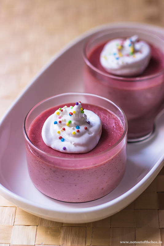 Smooth and luscious Italian Panna Cotta topped with sugary strawberries. This eggless, no bake dessert can be whipped up in no time.