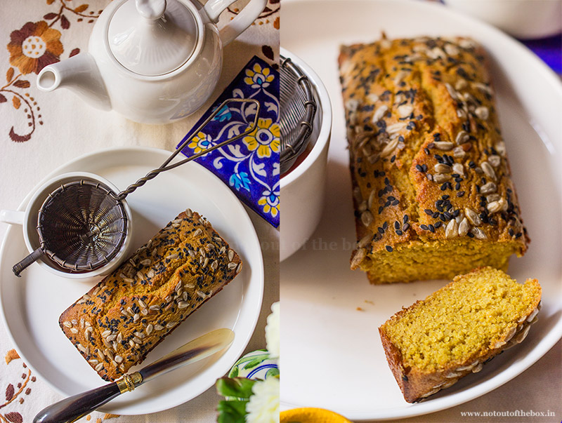 Mix all the dry ingredients in a bowl and keep aside. Now whisk all the wet ingredients in a separate bowl. Add in this wet mixture to the dry mix and whisk well. Transfer this mixture into the prepared loaf tin. Sprinkle some sunflower seeds and black sesame seeds on top. Bake for 30 minutes. Check for the doneness of baking by inserting a sharp knife in the middle of the loaf. The bread is ready if the knife comes out clean. If not, bake for some more time, and then check again.