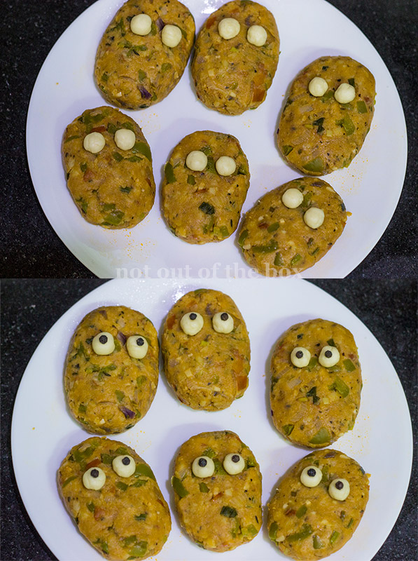Take out the patties from the refrigerator. To make the Mummy eyes place little dough balls on the patties as shown in the picture. After that press whole black peppercorns on top of the eyeballs. Press the black peppercorns gently inside the eyeball, only the top surface of the black peppercorn should be visible, otherwise, the black peppercorns would come out loose after baking, so, do it accordingly. Alternately for the eyes, you can use cloves also. Even I’ve found cloves are better because they sealed properly with the eyeball and didn’t come out after baking.