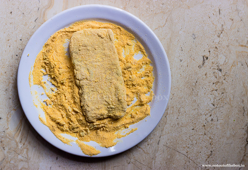 Now dip a marinated fish fillet first in whisked egg, then coat it with breadcrumbs. Repeat the steps again. That means each fish fillet need to be coated twice with egg wash and breadcrumbs. Do the coating of the fish fillets for one at a time. While coating with breadcrumbs use your fingers to give a neat shape to every fish fillet.